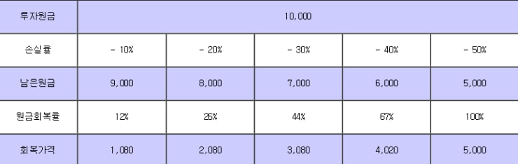 표에서 보면 - 10%의 손실을 만회하기란 그렇게 어렵지 않습니다. 그러나, -50%의 손실. 즉, 반 토막 난 주식을 원금 수준까지 회복시키기란 정말 어렵습니다.