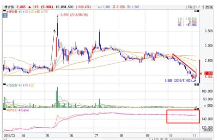 주가가 상승함에도 OBV가 이전의 고점아래에서 보합권에 머물고 있으면 주가 상승에 따라 보유 주식을 처분하려는 분산활동이 일어나고 있어 주가는 조만간에 하락합니다.