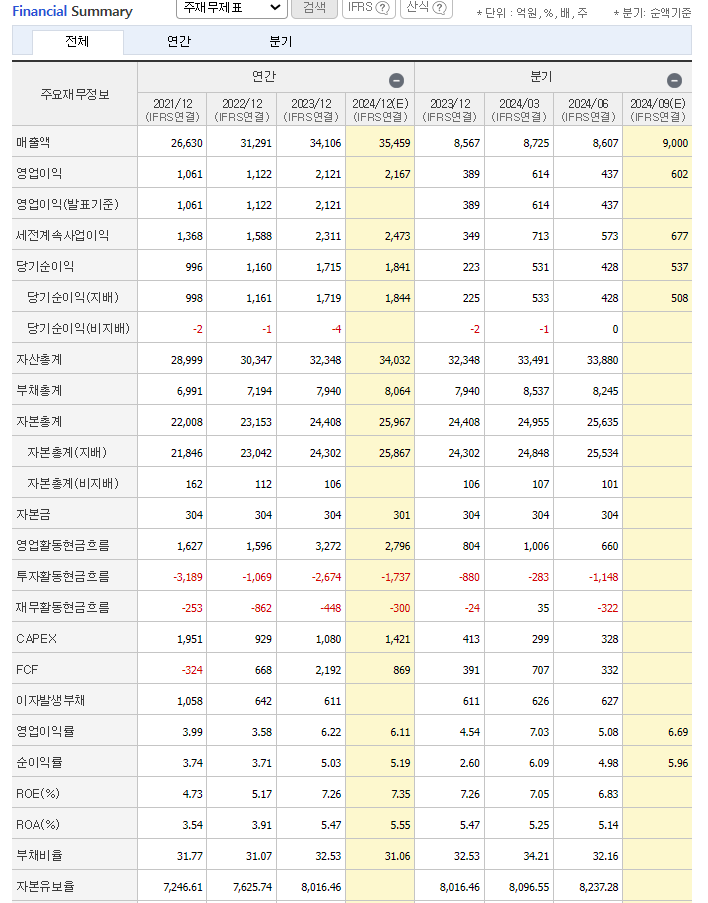 영업이익 역시 매출 증가와 함께 성장하고 있습니다. 2021년 1,061억 원에서 2023년에는 2,121억 원까지 상승했고, 2024년에는 2,167억 원을 목표로 하고 있습니다. 분기별로도 영업이익이 지속적으로 증가하고 있으며, 2024년 3분기에는 602억 원의 영업이익을 예상하고 있습니다. 재무 건전성도 매우 우수하며, CAPEX를 통한 설비 확장과 글로벌 진출을 통해 중장기적으로 더욱 성장할 가능성이 큽니다.