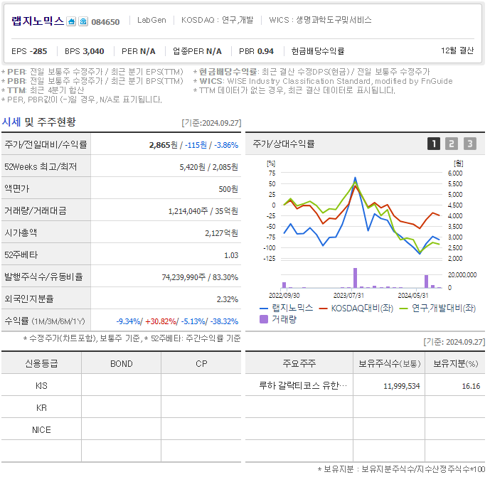 최근 랩지노믹스의 재무 상태는 매출 감소와 영업 손실로 인해 좋지 않은 상황입니다. 코로나19 팬데믹이 한창이던 시기에는 진단키트로 큰 수익을 올렸지만, 이후 수요 감소로 인해 매출이 줄어들었고, 영업손실로 전환되었습니다.