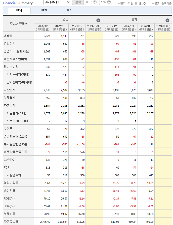 매출액은 2021년 2,024억 원에서 2022년 1,448억 원으로 크게 감소했으며, 2023년에는 731억 원으로 다시 줄어들었습니다. 코로나19 이후 진단키트 수요 감소로 인한 영향이 매출 감소에 큰 요인으로 보입니다.