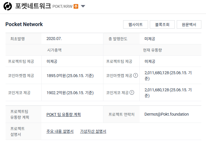 2025년 6월 15일 기준, POKT의 시장 데이터는 다음과 같다: