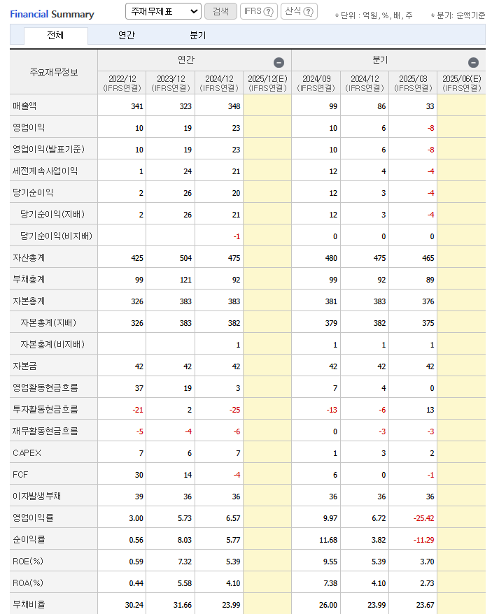 푸른기술의 재무 건전성은 양호한 수준입니다. 2024년 말 기준 자산총계는 475억 원, 부채총계는 92억 원으로, 부채비율은 23.99%를 기록하며 업종 내 낮은 수준을 유지하고 있습니다. 자본총계는 383억 원으로, 자본유보율은 845.88%에 달해 재무 안정성이 뛰어납니다. 이자발생부채는 36억 원으로, 영업활동현금흐름(3억 원)과 비교해 부담이 크지 않습니다. 순부채비율은 -16.38%로, 현금성 자산이 부채를 상회하며 유동성 리스크가 낮음을 확인할 수 있습니다.