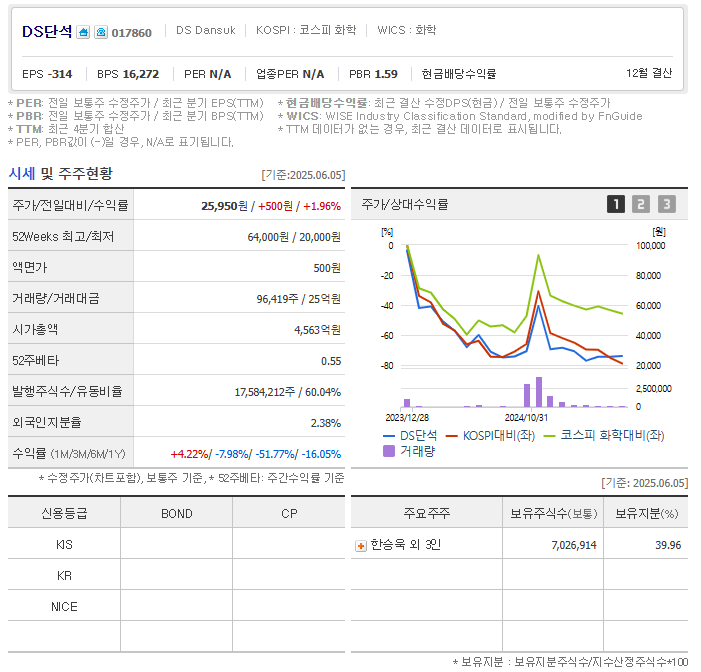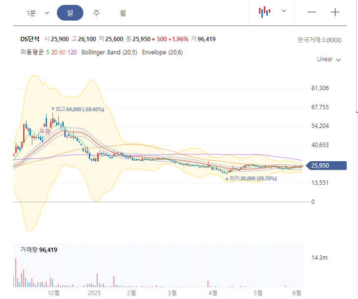 2025년 6월 5일 기준, DS단석의 주가는 25,950원으로 전일 대비 1.96% 상승하였습니다. 52주 최고가는 64,000원, 최저가는 20,000원으로, 현재 주가는 52주 저점에 가까운 수준입니다. 6개월 수익률은 -51.77%로 부진하였으나, 최근 1개월 수익률은 4.22%로 반등 조짐을 보이고 있습니다. 최근 친환경 정부가 들어서면서 관련 테마는 다시 한번 상승할 것으로 보입니다.