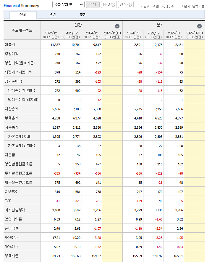 외국인 지분율은 2.38%로 낮은 편이며, 기관의 최근 1개월 누적 순매수는 제한적입니다. 시장의 관심이 아직 본격화되지 않았음을 시사하며, 향후 실적 개선과 함께 투자자 관심이 증가할 가능성이 있습니다. 주가가 오르기 위해서는 이제 흑자 기업으로 바뀌어야 됩니다.