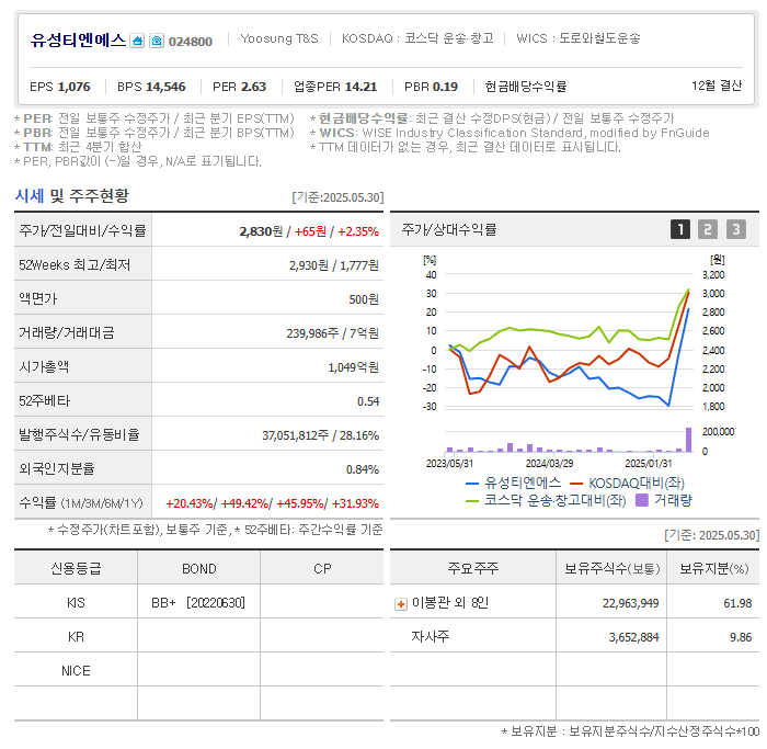 유성티엔에스는 1977년에 설립되어 1999년 코스닥 시장에 상장된 종합물류기업입니다. 현재 주식회사 유성티엔에스라는 사명을 사용하며, 공로운송, 하역, 철도운송, 포워딩 등 물류 전반에 걸친 서비스를 제공합니다. 특히 철강재 물류에 강점을 보유하고 있으며, 포스코와 현대제철 등 국내 대형 철강업체와의 안정적인 계약을 통해 매출 기반을 다져왔습니다.