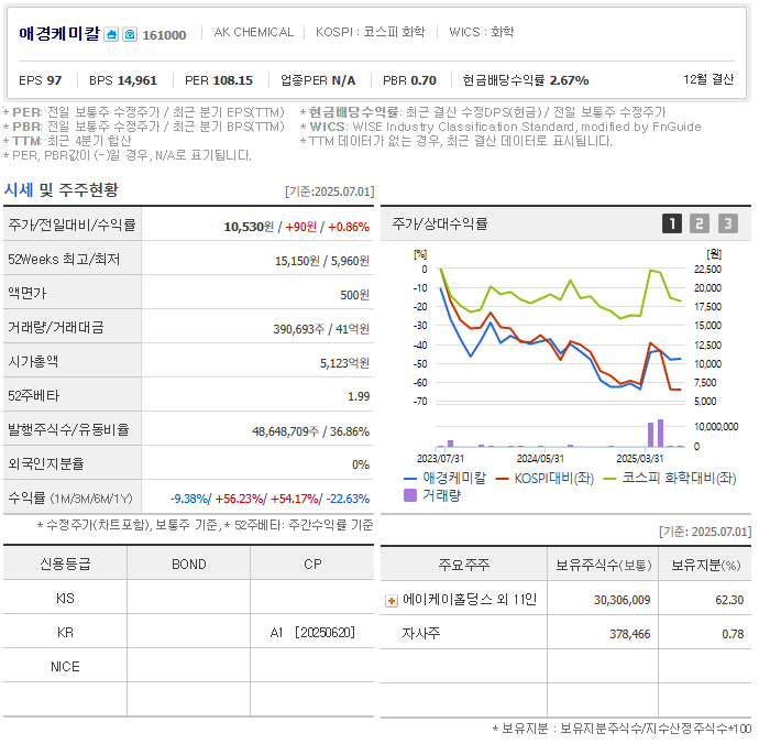 또한, 애경케미칼의 주주 구조를 살펴보면, AK홀딩스가 62.20%의 지분을 보유하고 있으며, 외국인 보유 비율은 0.75%로 낮은 편이다. 유동비율이 36.93%로 비교적 낮아 주가 급등 시 유리할 수 있으나, 시장 과열로 인한 변동성 리스크도 존재한다. 따라서 투자자는 기술 개발 속도, 글로벌 파트너십 체결 여부, 그리고 정부의 나트륨이온배터리 국책 과제 진행 상황을 면밀히 모니터링해야 한다.