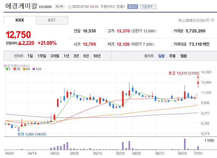 애경케미칼(161000)은 최근 나트륨이온배터리(Sodium Ion Battery, SIB) 관련 기술 개발과 상용화 소식으로 주식 시장에서 큰 주목을 받고 있다. 2025년 7월 2일 기준, 애경케미컬의 주가는 전일 대비 19.66% 상승한 12,600원에 거래되며 강한 상승세를 기록했다. 이는 글로벌 배터리 기업들과의 납품 테스트 진행 소식과 함께, 국내 최초로 이차전지용 하드카본 개발에 성공한 기업으로서의 경쟁력이 부각된 결과로 풀이된다.