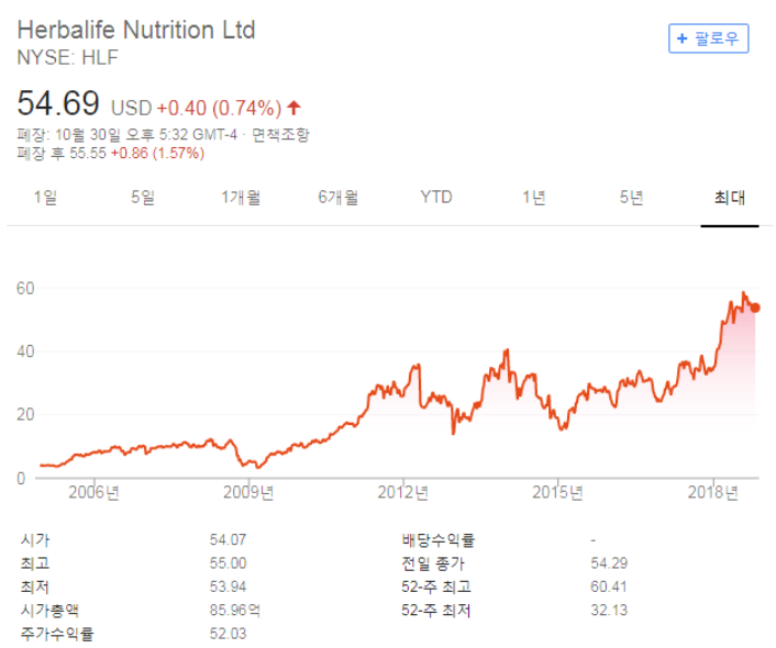 허버라이프는 위와 같이 계속해서 더욱 성장을 하였으며 주가는 폭등을 하게 됩니다. 이로 인해서 애커먼은 울며 겨자 먹기로 공매도 포지션을 정리하여서 수천억을 손실을 보았고 칼 아이칸은 5000억 원 이상을 벌었습니다.