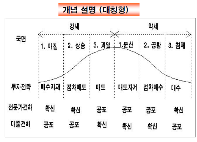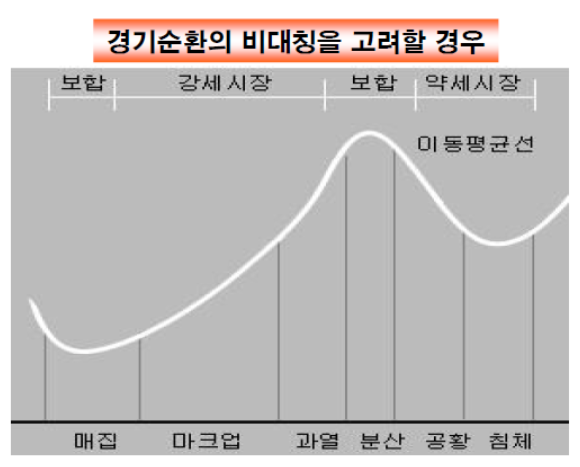 경기순환의 비대칭을 고려할 경우에 한국은 다음과 같이 나타납니다. 평균적으로 경기 순환 주기는 확장기 33개월 수축기 19개월로 확장기가 수축기보다 긴 경향이 있습니다. 주추세의 구간에 따라 크게 강세와 약세장으로 나누고 이 둘을 다시 3개의 국면으로 나눕니다. 매집, 상승, 과열, 분산, 공황, 침체의 총 6개 국면으로 나누어서 되고 있으며, 완만히 오르다가 급격하게 하락하는 이유가 이런 비대칭성이 있기 때문입니다.