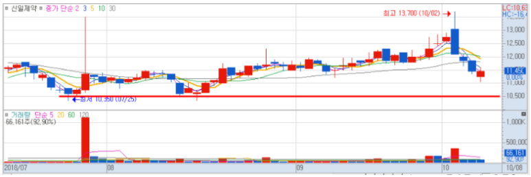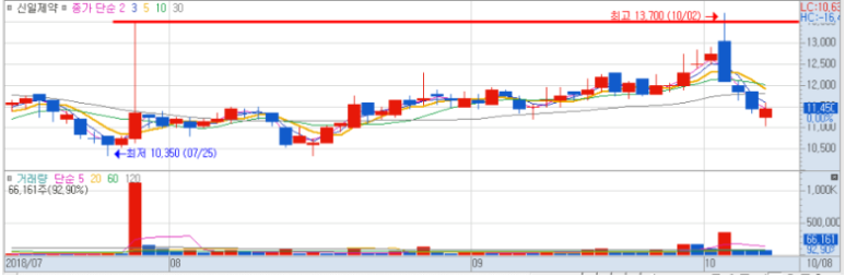 신일제약의 경우 보시면 직전 고점과 연결된 저항선이 설정되어서 최대 목푯값을 설정할 수 있으며 1차 매도 시점을 잡을 수 있습니다.
