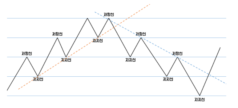 지지가 되는 부분을 모아 이은 선을 지지선이라고 하며 저항이 되는 부분을 모아서 이어 선으로 만든 것을 저항선이라고 합니다.