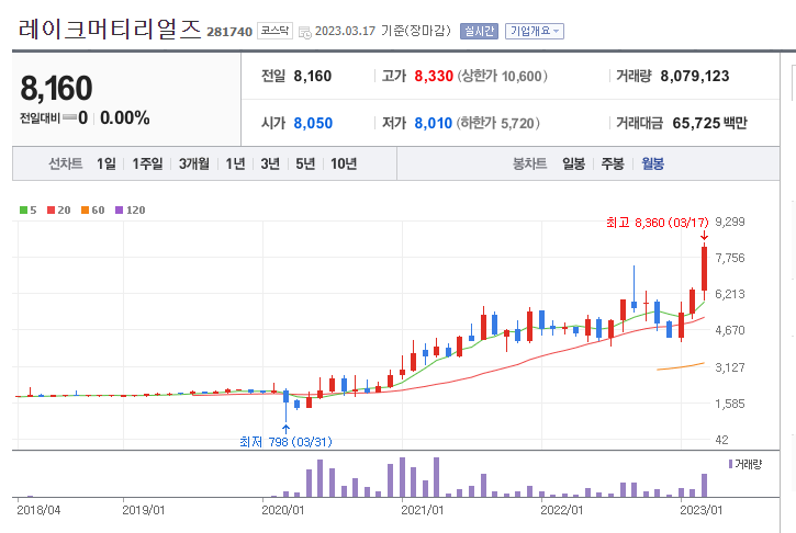 저 또한 레이크머티리얼즈를 동전주에서도 본 적이 있고, 3천 원대에서 매수를 한 경험도 있습니다. (현재는 관망 중)
