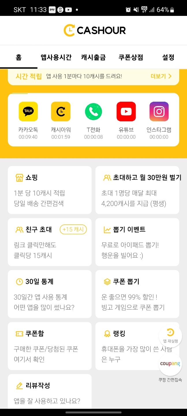 카카오톡, 인스타, 틱톡, 유튜브 등 1분 사용할 때마다 10 캐시를 증정합니다.