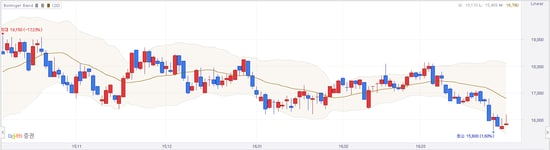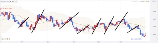 반면 하단 볼린저 밴드와 캔들이 만나는 지점에서의 추세를 보면 아시겠지만 상승하는 추세를 보이고 있습니다.
