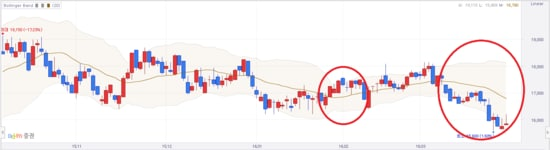 차트를 보시면 작은 동그라미의 경우 볼린저 밴드의 상단과 하단의 밴드의 폭이 줄어서 가격이 형성되고 있다는 것을 알려주는 지표입니다. 큰 동그라미의 경우에는 과매도가 일어나는 시점으로 보이며 가격이 급격히 하락했다는 것을 알려주는 지표입니다.