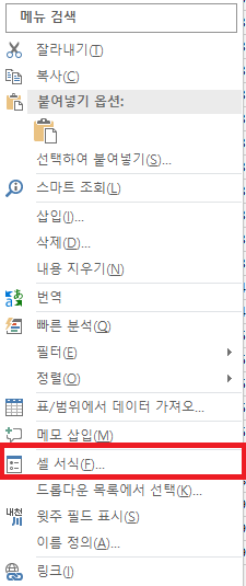 작업을 원하는 셀을 오른쪽 마우스 클릭하면, 셀 서식이 있습니다. 단축키는 F.